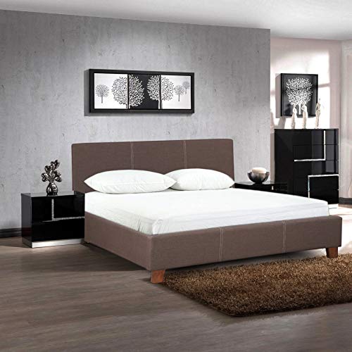 The bed frame is crafted of durable wood and is complete with upholstered fabric.
