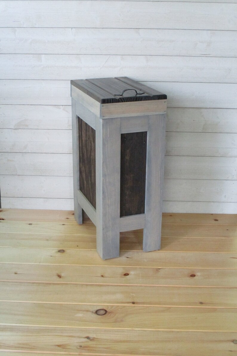 This garbage can is made from new and reclaimed woods to give it a more modern yet rustic look.